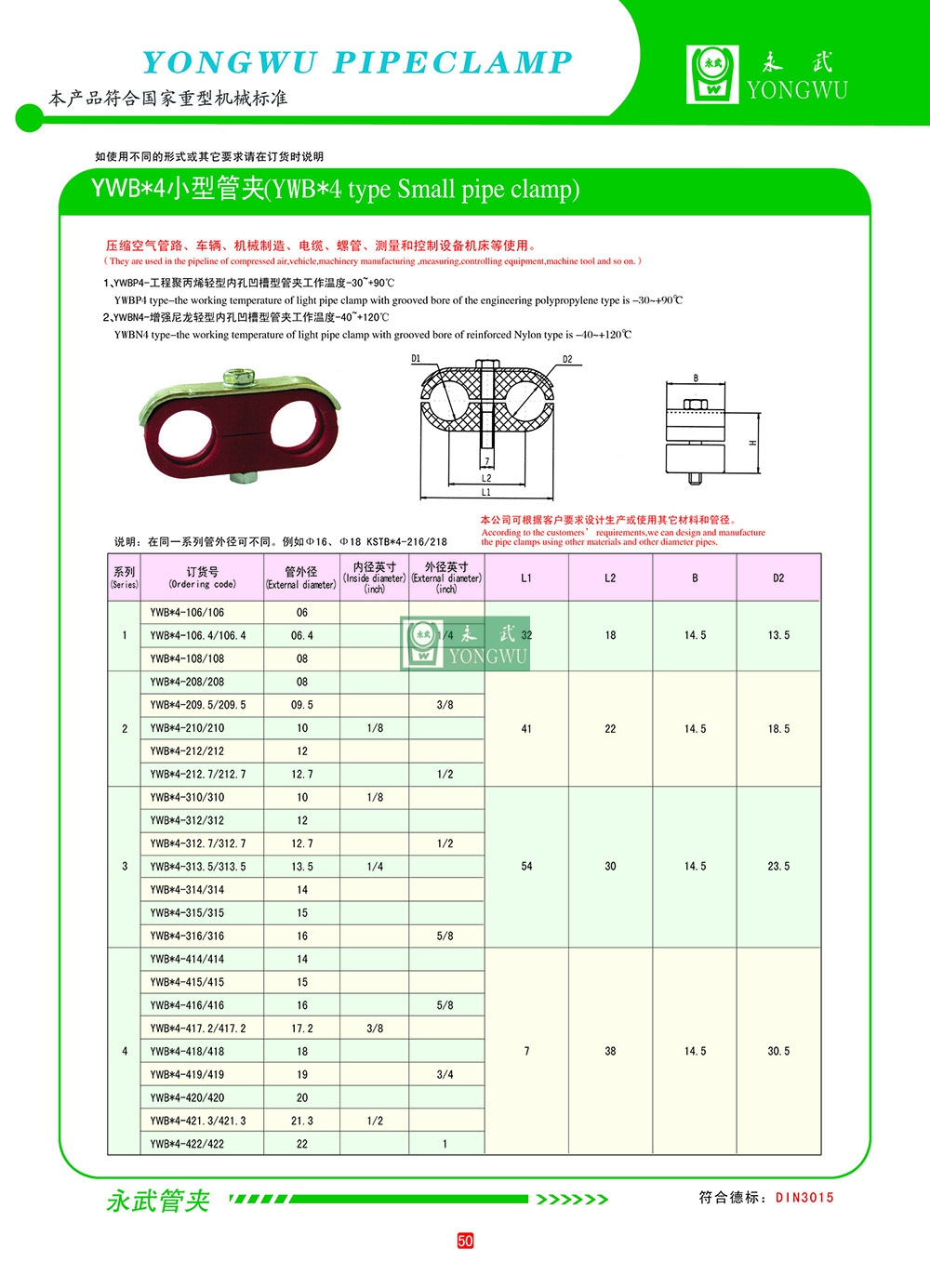 可根据要求定制规格加工,产品广泛应用于冶金、船舶、海洋工程、重型机械、工程机械、机床、电力、造纸、化工、液压系统等工业领域。主要产品有U型管夹、钢制管夹、扁钢管夹、铝合金管夹、船用管夹、塑料管夹、重型管夹、轻型管夹、防震管夹、液压管夹、管道配件等24个系列产品。