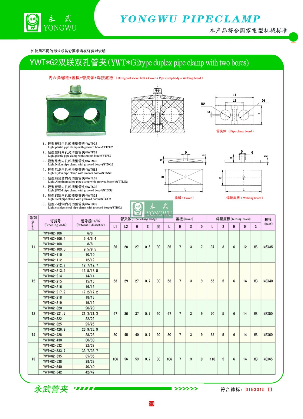 可根据要求定制规格加工,产品广泛应用于冶金、船舶、海洋工程、重型机械、工程机械、机床、电力、造纸、化工、液压系统等工业领域。主要产品有U型管夹、钢制管夹、扁钢管夹、铝合金管夹、船用管夹、塑料管夹、重型管夹、轻型管夹、防震管夹、液压管夹、管道配件等24个系列产品。