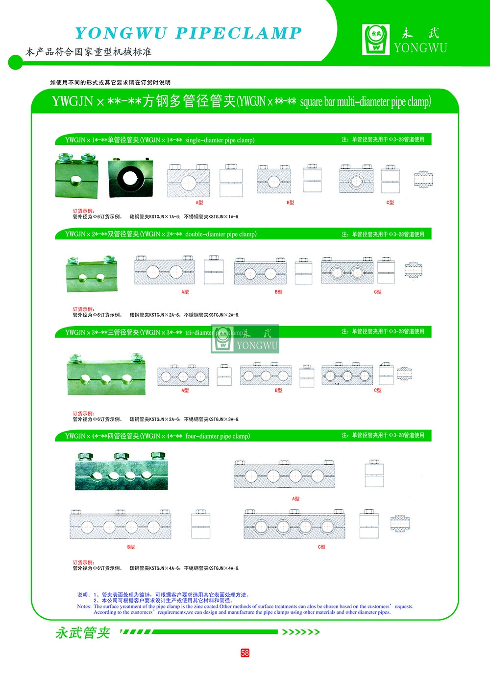 产品广泛应用于冶金、船舶、海洋工程、重型机械、工程机械、机床、电力、造纸、化工、液压系统等工业领域。主要产品有U型管夹、钢制管夹、扁钢管夹、铝合金管夹、船用管夹、塑料管夹、重型管夹、轻型管夹、防震管夹、液压管夹、管道配件等24个系列产品。