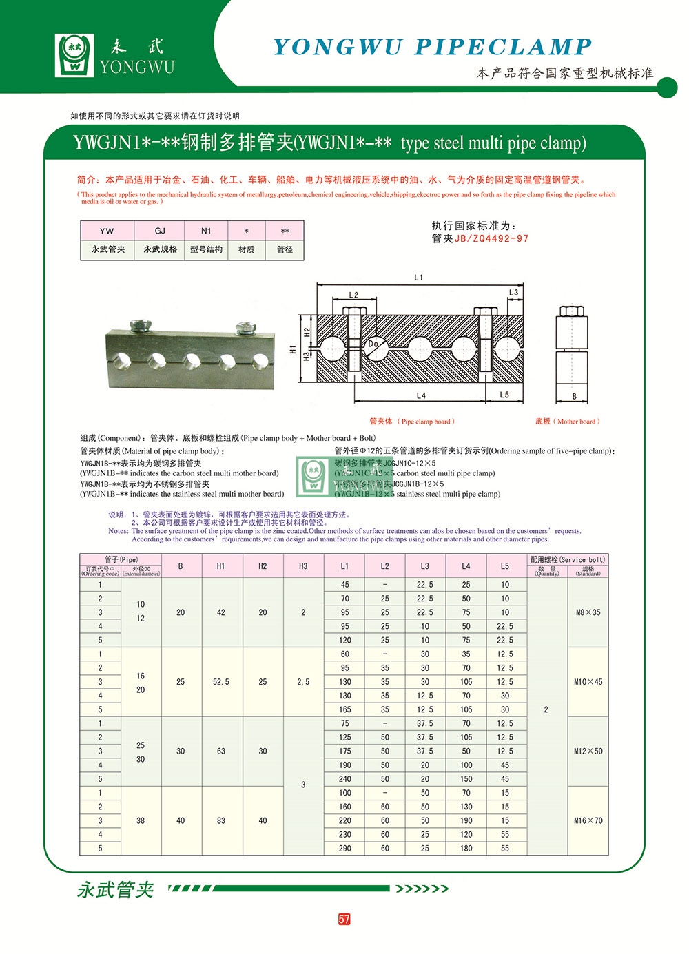 产品广泛应用于冶金、船舶、海洋工程、重型机械、工程机械、机床、电力、造纸、化工、液压系统等工业领域。主要产品有U型管夹、钢制管夹、扁钢管夹、铝合金管夹、船用管夹、塑料管夹、重型管夹、轻型管夹、防震管夹、液压管夹、管道配件等24个系列产品。