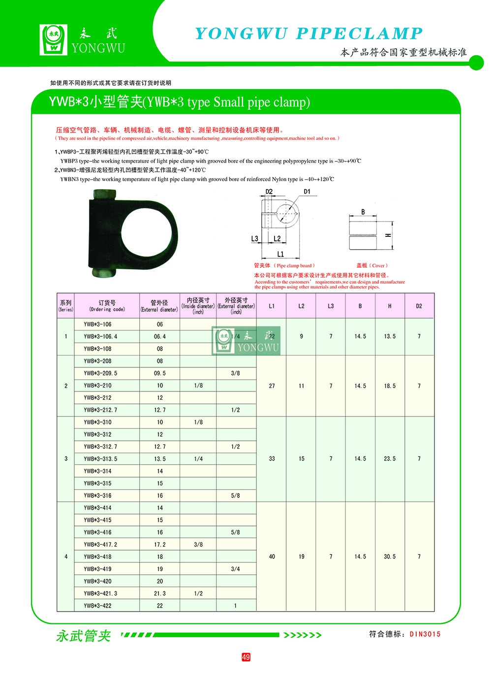 可根据要求定制规格加工,产品广泛应用于冶金、船舶、海洋工程、重型机械、工程机械、机床、电力、造纸、化工、液压系统等工业领域。主要产品有U型管夹、钢制管夹、扁钢管夹、铝合金管夹、船用管夹、塑料管夹、重型管夹、轻型管夹、防震管夹、液压管夹、管道配件等24个系列产品。