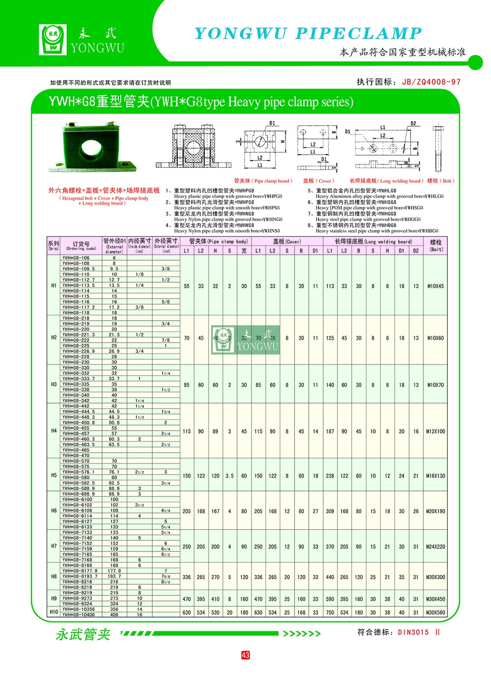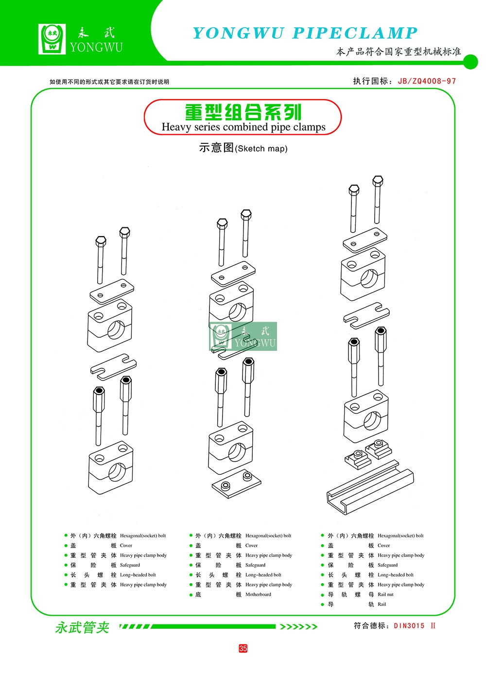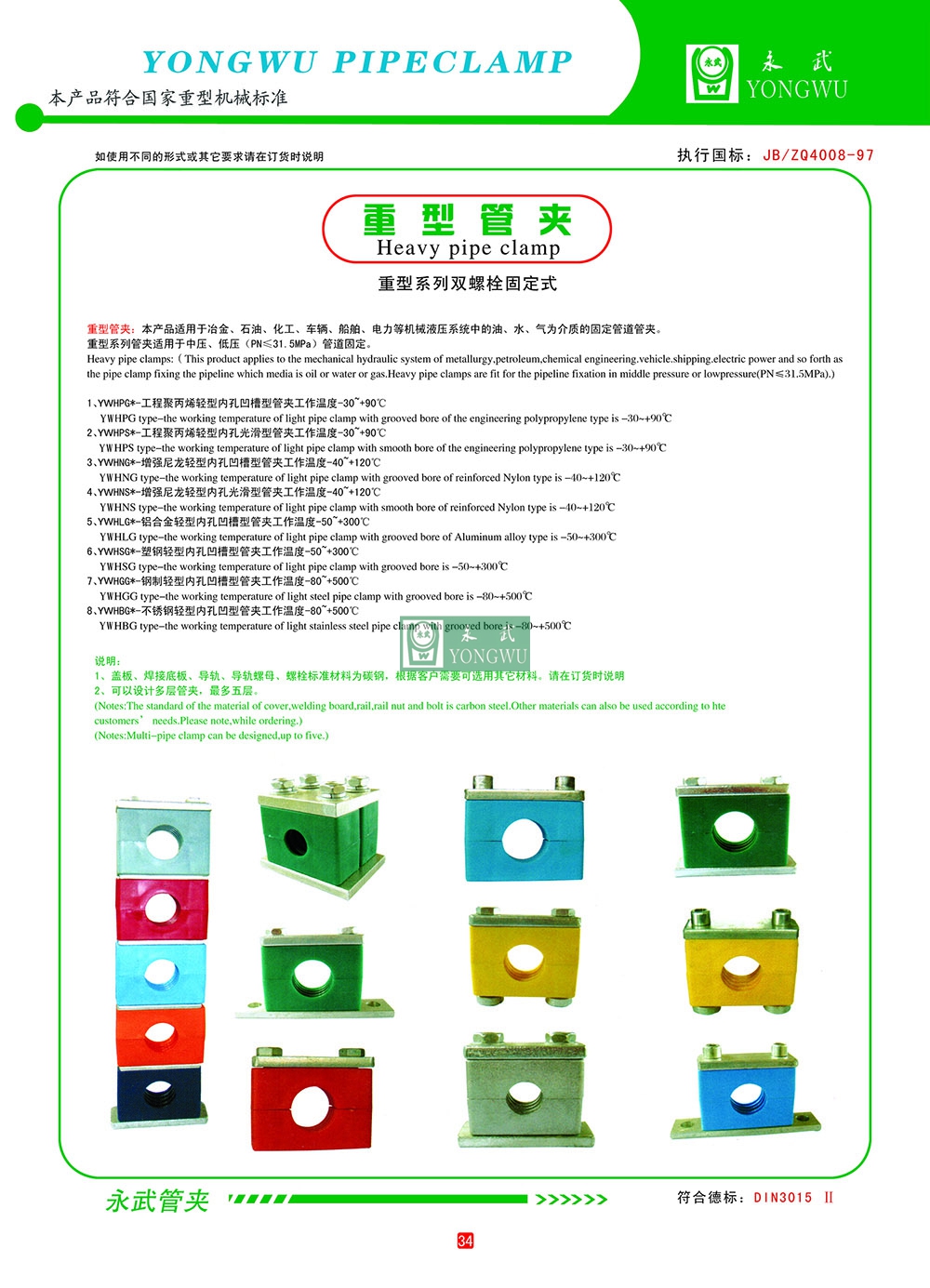 可根据要求定制规格加工,产品广泛应用于冶金、船舶、海洋工程、重型机械、工程机械、机床、电力、造纸、化工、液压系统等工业领域。主要产品有U型管夹、钢制管夹、扁钢管夹、铝合金管夹、船用管夹、塑料管夹、重型管夹、轻型管夹、防震管夹、液压管夹、管道配件等24个系列产品。